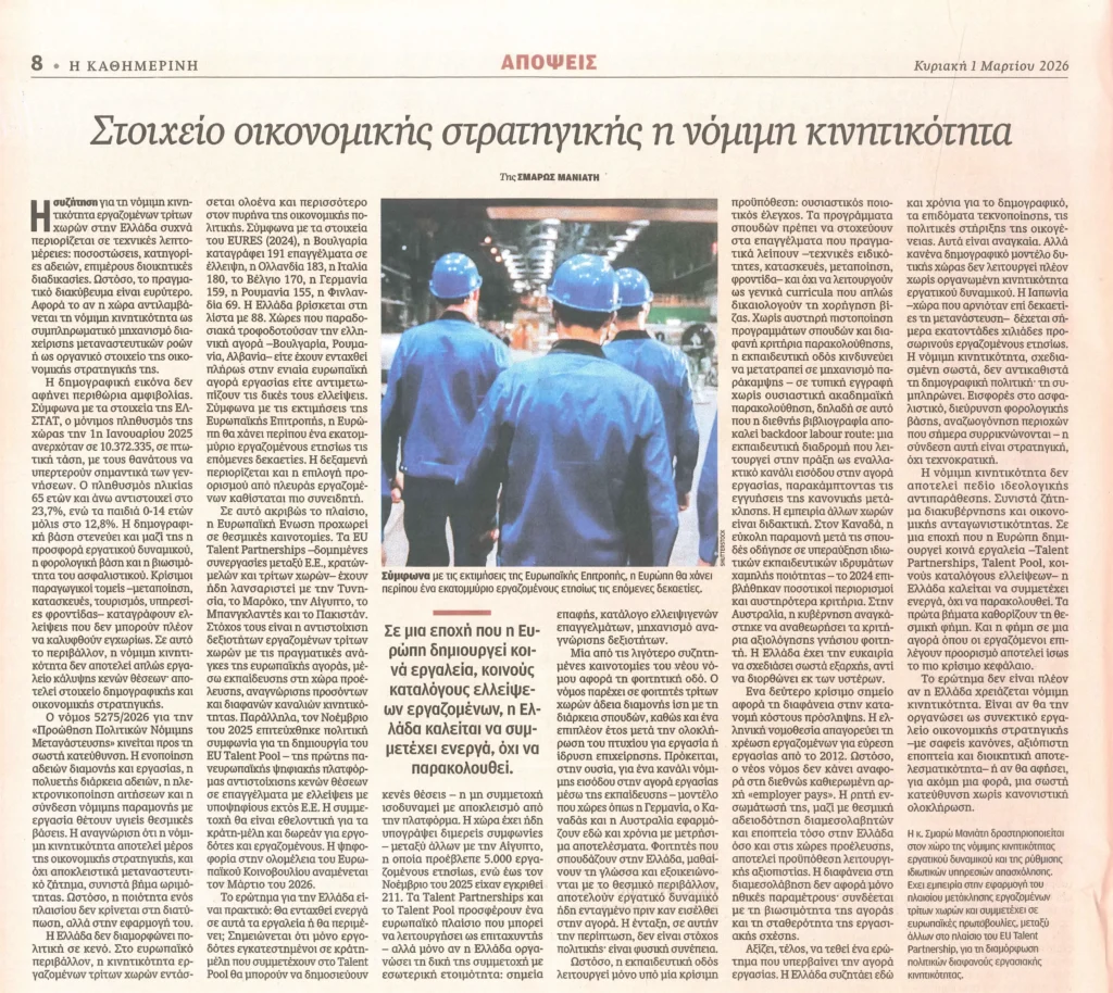 Η απάντηση γίνεται όλο και πιο ξεκάθαρη. Η δημογραφική βάση στενεύει, οι ανάγκες προσωπικού αυξάνονται και κρίσιμοι τομείς της οικονομίας δυσκολεύονται πλέον να καλύψουν τα κενά τους εγχώρια. Σε αυτό το πλαίσιο, η νόμιμη κινητικότητα δεν είναι απλώς μια λύση για κενές θέσεις. Είναι τμήμα μιας ευρύτερης στρατηγικής για τη λειτουργία της αγοράς, τη φορολογική βάση, την κοινωνική συνοχή και τη μακροπρόθεσμη ανθεκτικότητα της οικονομίας.